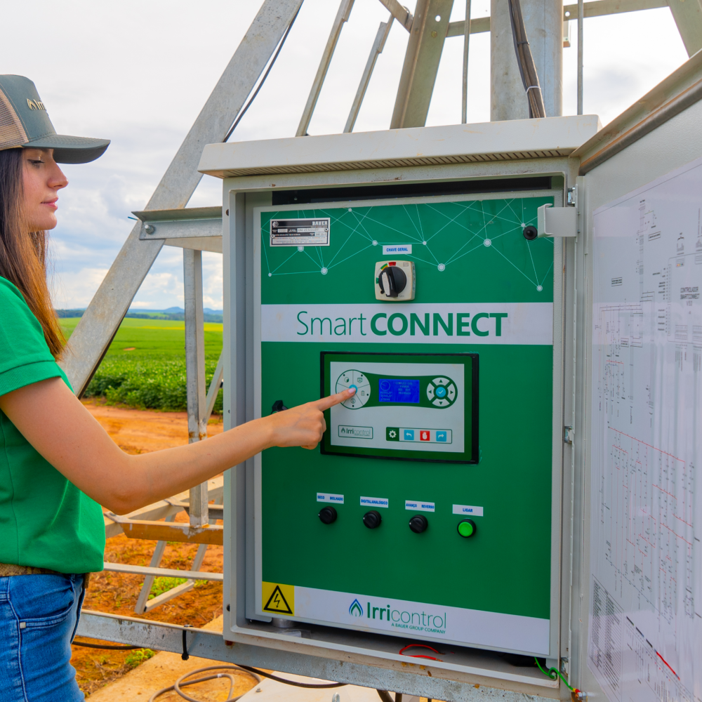 O painel SmartConnect contém a tecnologia Irricontrol embarcada para controle e monitoramento dos Pivôs de Irrigação Bauer®. Além de acionar de forma digital, o painel também possibilita o acionamento de forma analógica.
